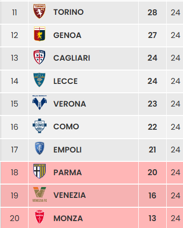 Per il resto, gli appuntamenti interessanti non mancano. Oltre naturalmente a Fiorentina-Como, match che stiamo snocciolando in tutte le salse con altri articoli. Il derelitto Monza ospiterà il Lecce: il ritorno di Nesta restituirà linfa ai brianzoli, oppure i salentini si prenderanno tre punti fondamentali per allontanarsi dalla zona rossa? Il Venezia è sicuramente più vivo rispetto al Monza e andrà a Genova con propositi bellicosi e probabilmente con più stimoli rispetto ai rossoblu. Risalendo la classifica troviamo il Parma, che rappresenta il limite del terzultimo posto: i ducali ospiteranno una Roma piena di scorie europee. Partite impegnative anche per Verona (in casa del Milan), Cagliari (a Bergamo, ma per Atalanta e Milan queste partite arrivano tra due turni fondamentali di Champions) ed Empoli (a Udine).
