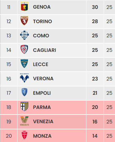 Chi farà la sorpresa? Qualcuno probabilmente ci riuscirà, perché è statisticamente difficile che tutte le partite vadano secondo pronostico. Noi speriamo sia il Como, unica insieme al Genoa nella parte destra della classifica ad essere reduce da una vittoria. Il fatto inoppugnabile è che questa settimana non ci saranno scontri diretti: il calendario ha accoppiato ognuna delle prime dieci con una delle ultime dieci.