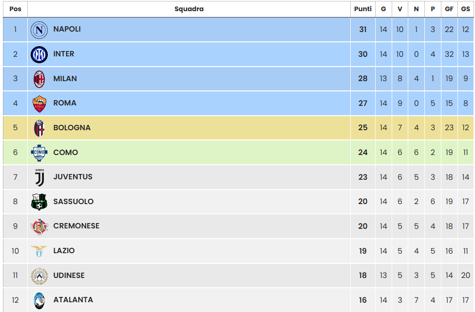 Tutto grazie ai risultati delle altre. La vittoria del Napoli ha allontanato i partenopei dai lariani (però parliamo di una squadra probabilmente irraggiungibile per quest’anno) e ha contemporaneamente tenuto dietro la Juventus. Siamo quindi ancora sesti, ancora a +1 dalla Vecchia Signora. E a -1 dal Bologna, che ha pareggiato con la Lazio: risultato positivo, perché i rossoblu non ci hanno staccato troppo e allo stesso tempo i biancocelesti non hanno accorciato le distanze tra noi e l’ottava piazza. La corsa al piazzamento tra le prime sette quindi per ora si fa sui sorprendenti Sassuolo e Cremonese, distanti quattro punti da noi. Ma occhio all’Udinese: se vincesse stasera, raggiungerebbe quota 21. Segnaliamo anche una nuova sconfitta per la sempre temibile Atalanta, che resta a -8.
