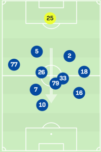 Questo lo si vede anche dalle posizioni medie Sofascore che vedete qui sotto. Un 4-2-3-1 abbastanza leggibile. Ok, Moreno leggermente più alto di VDB, Paz forse un filino più basso di quanto ci si potrebbe aspettare, ma parliamo di dettagli. Ben più confusionario lo schieramento contro la Fiorentina.